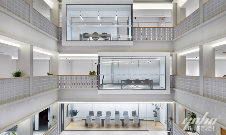 一整面的磁吸书写墙非常的实用又简捷。通透无遮挡的中庭是本案发挥设计才能的又一个亮点,勾勒出一幅开放有序、舒适自由的美学画面。